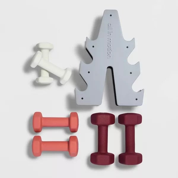 Includes: (2) 3 lb. Weights, Storage Rack, (2) 5 lb. Weights, (2) 8 lb. Weights