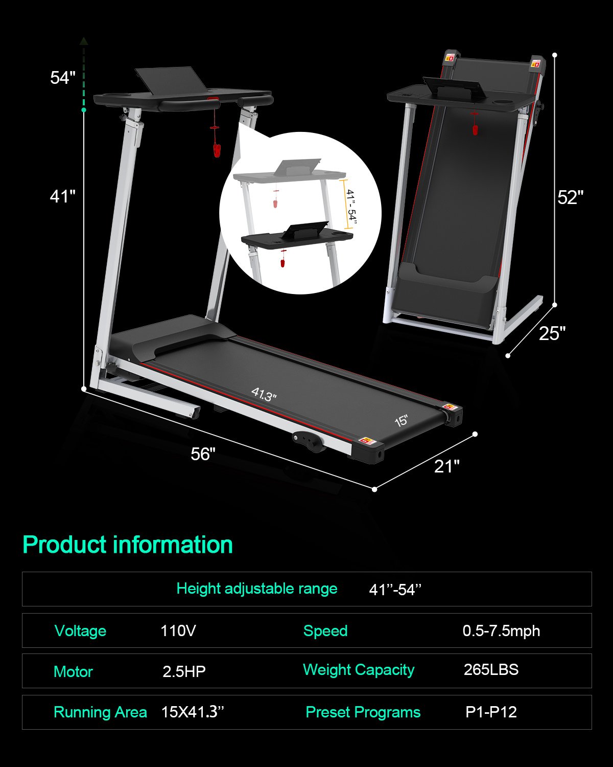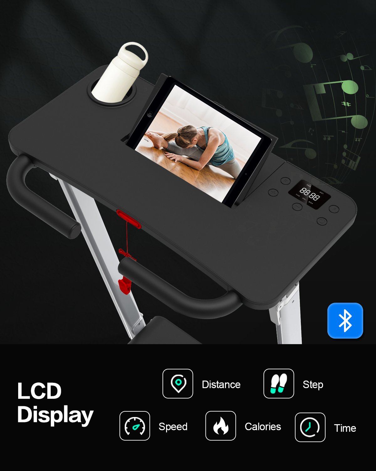 ?[Folding Treadmill with Desk]The folding treadmill has a large desk that you can place a laptop, pad, book and other, the size of desk is 25.2"(L) x 11.8"(W). The built-in multifunctional LCD display tracks your performance including time, speed, distance, calories and step, promising a superior and effective home treadmill workout.