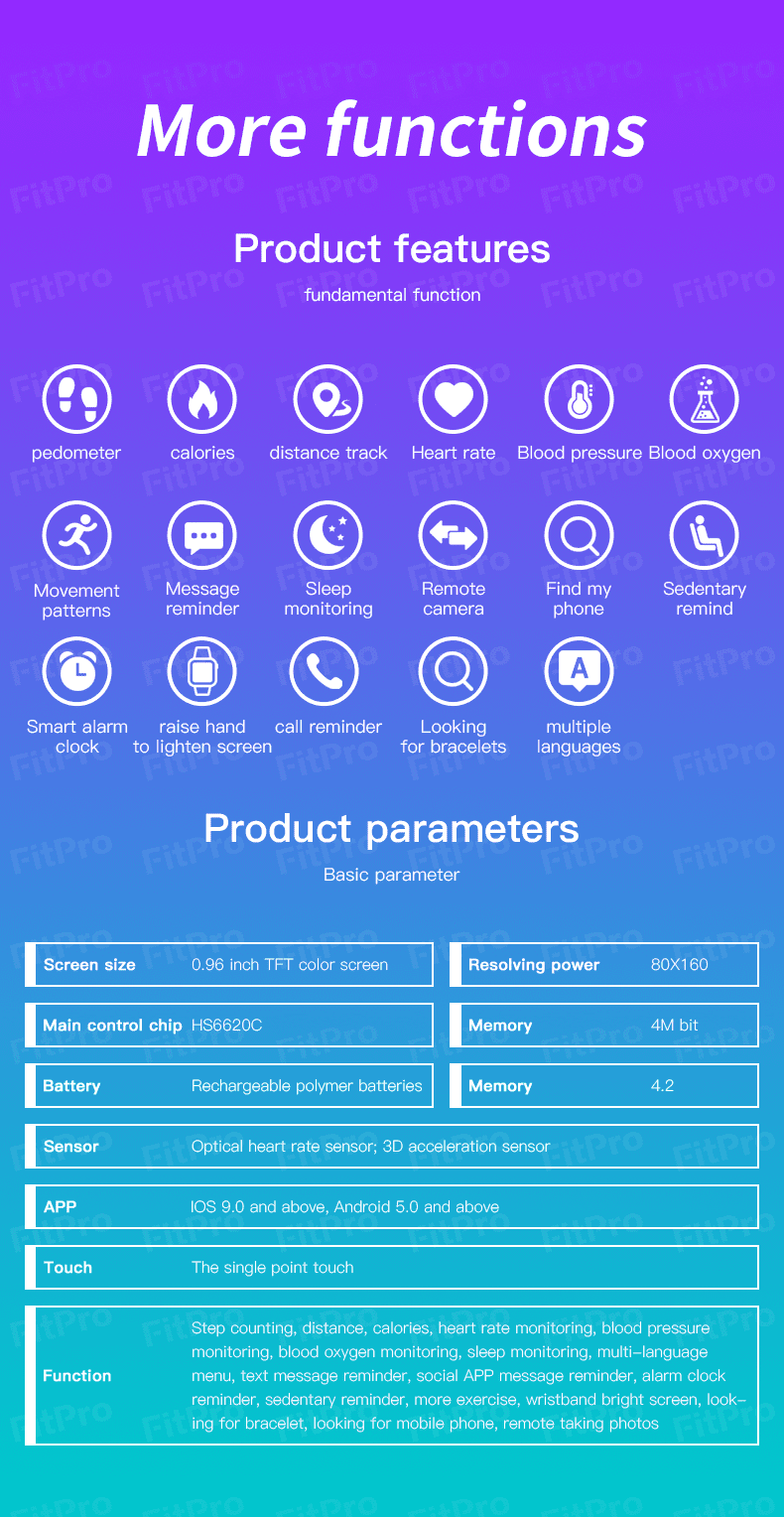 Deportes y Salud: sincronización de información; calidad de sueño; pasos; distancia; calorías; IP65 a prueba de polvo e impermeable; multilenguaje; control de la cámara del teléfono.