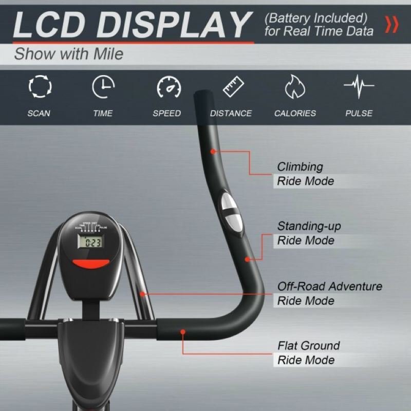 4.You can see the time, calories, distances, speed, and heart rate on the LCD monitor to accurately manage your workout effect. The handlebar has a built-in monitor sensor to collect your heart rate number.