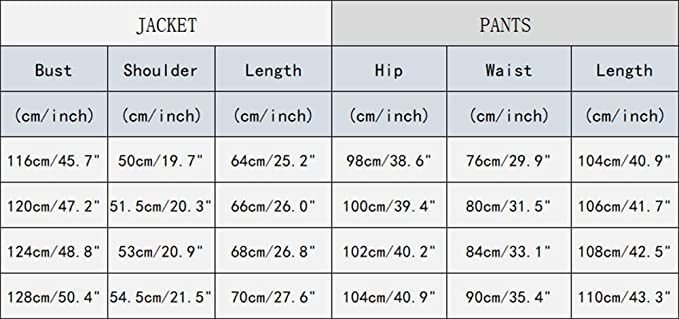 Style: CasualSize Notes:* Size:SJacket---Bust:116cm/45.7"-----Shoulder:50cm/19.7"---Length:64cm/25.2"Pants----Waist:76cm/29.9"-----Hip:98cm/38.6"------Length:104cm/40.9"* Size:MJacket---Bust:120cm/47.2"-----Shoulder:51.5cm/20.3"---Length:66cm/26.0"Pants----Waist:80cm/31.5"-----Hip:100cm/39.4"-------Length:106cm/41.7"* Size:LJacket---Bust:124cm/48.8"-----Shoulder:53cm/20.9"---Length:68cm/26.8"Pants----Waist:84cm/33.1"-----Hip:102cm/40.2"------Length:108cm/42.5"* Size:XLJacket---Bust:128cm/50.4"-----Shoulder:54.5cm/21.5"---Length:70cm/27.6"Pants----Waist:90cm/35.4"-----Hip:104cm/40.9"-------Length:110cm/43.3"Delivery:We will ship out your orders within 7 business day by E-packet or other commercial post service. We have Standard Shipping service and Expedited shipping to choose.About Standard Shipping service, the packages will usually take about 7-15 business days to be delivered to you .About Expedited shipping, the packages will usually take about 4-6 business days to be delivered to you .Note1. Please allow 1-2cm differs due to manual measurement.