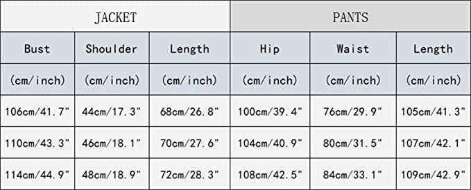 Style: CasualSize Notes:* Size:SJacket---Bust:106cm/41.7"-----Shoulder:44cm/17.3"---Length:68cm/26.8"Pants----Waist:76cm/29.9"-----Hip:100cm/39.4"------Length:105cm/41.3"* Size:MJacket---Bust:110cm/43.3"-----Shoulder:46cm/18.1"---Length:70cm/27.6"Pants----Waist:80cm/31.5"-----Hip:104cm/40.9"------Length:107cm/42.1"* Size:LJacket---Bust:114cm/44.9"-----Shoulder:48cm/18.9"---Length:72cm/28.3"Pants----Waist:84cm/33.1"-----Hip:108cm/42.5"------Length:109cm/42.9"Delivery:We will ship out your orders within 7 business day by E-packet or other commercial post service. We have Standard Shipping service and Expedited shipping to choose.About Standard Shipping service, the packages will usually take about 7-15 business days to be delivered to you .About Expedited shipping, the packages will usually take about 4-6 business days to be delivered to you .Note1. Please allow 1-2cm differs due to manual measurement.2. Please allow little color difference due to different computers' displayer, camera or light environment.