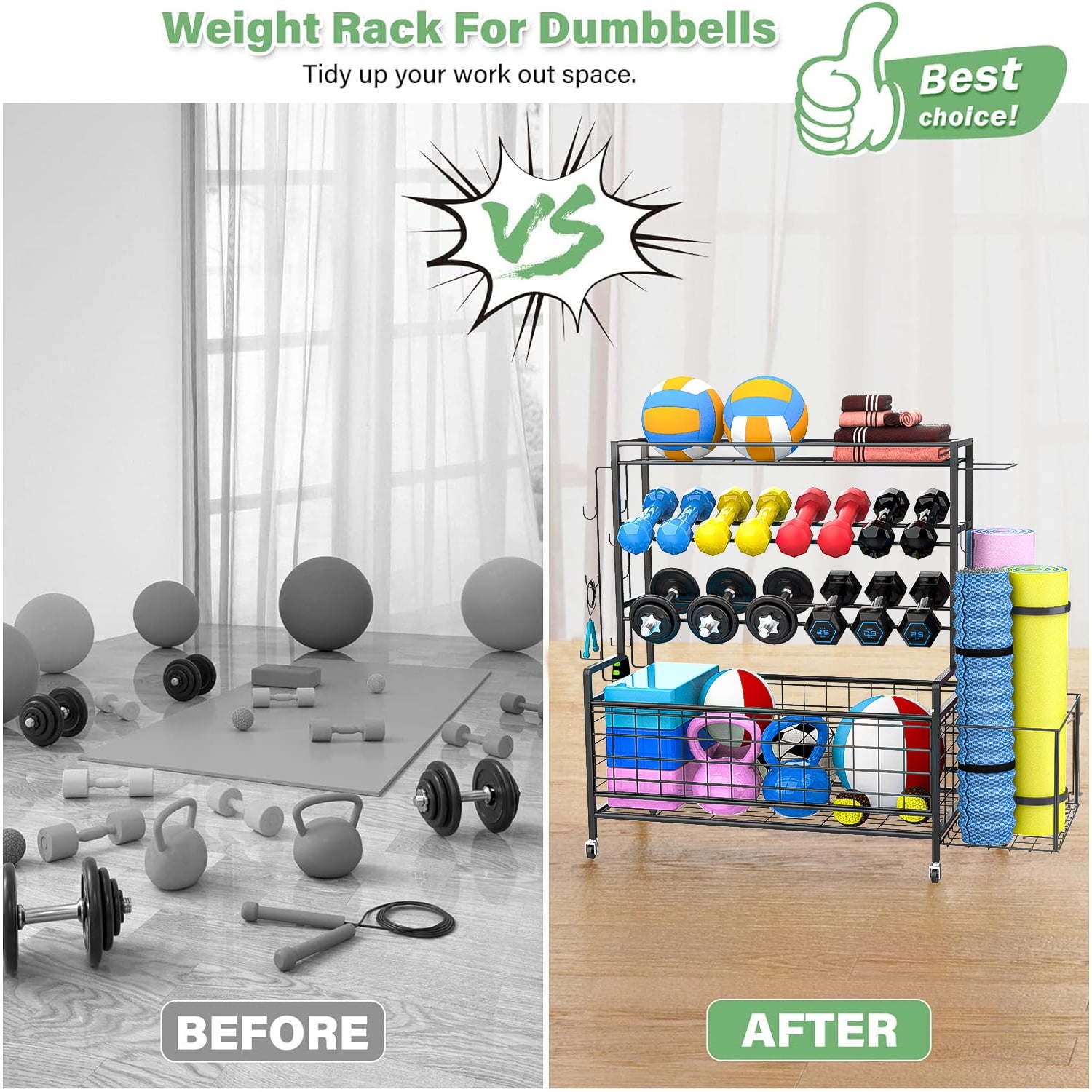 [Store various items]: This exercise storage organizer can help you store your yoga mat, dumbbells, kettlebells, yoga bricks, resistance bands, rollers, foam rollers, etc. Perfect for yoga enthusiasts.Durable: The dumbbell stand fitness device is made of high-quality metal materials, carefully processed, and designed to be sturdy, wear-resistant, and durable. The dumbbell stand can hold up to 300 pounds and can meet your fitness equipment storage needs.